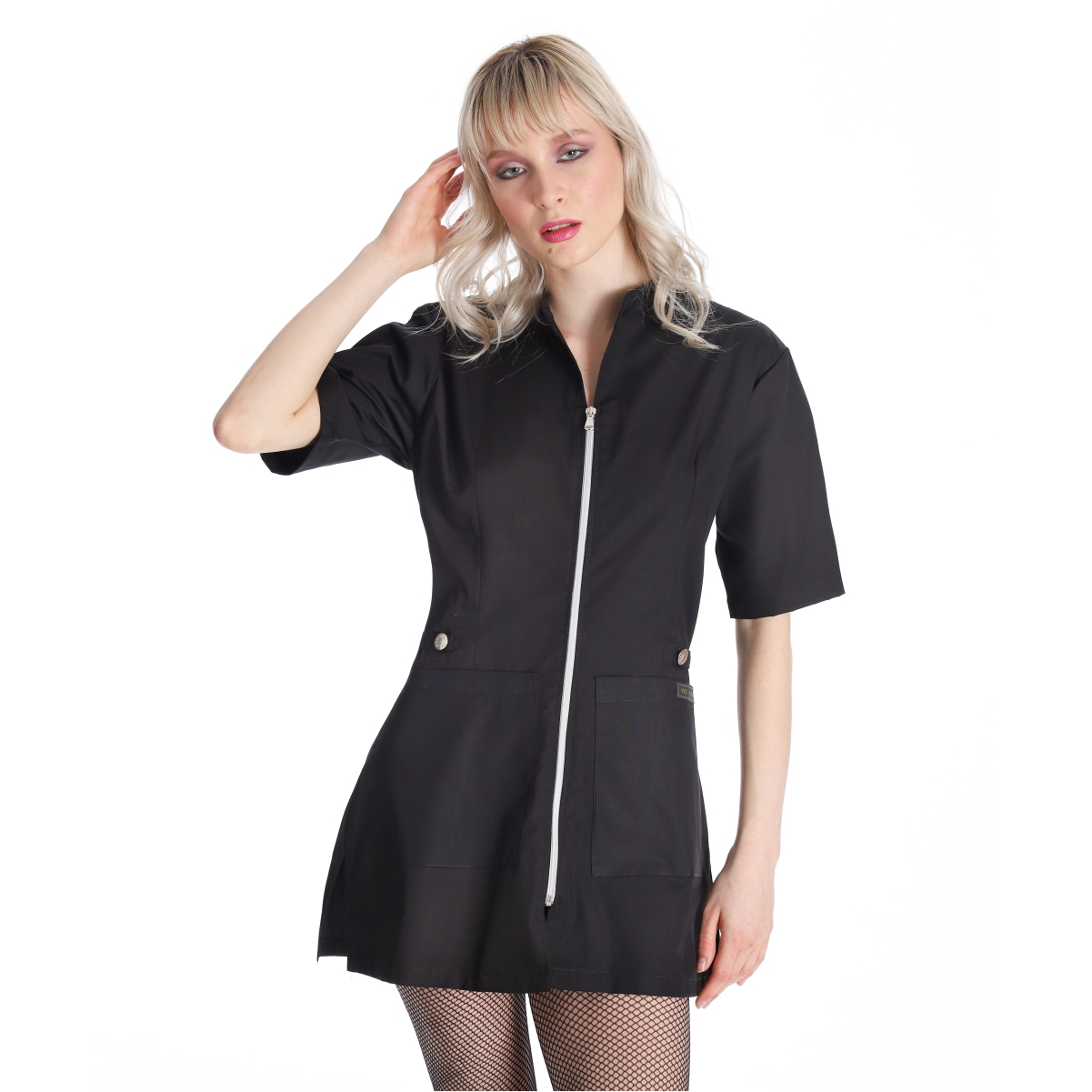 Elegante, aderente, ricco di dettagli e valorizzato da bottoni jeans, con un look contemporaneo, il camice Alyssa è un classico modello trasversale. Realizzato in policotone easy care, adatto ai lavaggi frequenta, presenta una zip grintosa, con l’inserimento di due piccole martingale sui fianchi, che valorizzano la silhouette. Piccolo colletto alla coreana e scollo a V che si può portare anche aperto come collo a revers. Immancabili le due tasche e i profondi spacchi laterali che consentono piena libertà dei movimenti. Vestibilità Aderente.