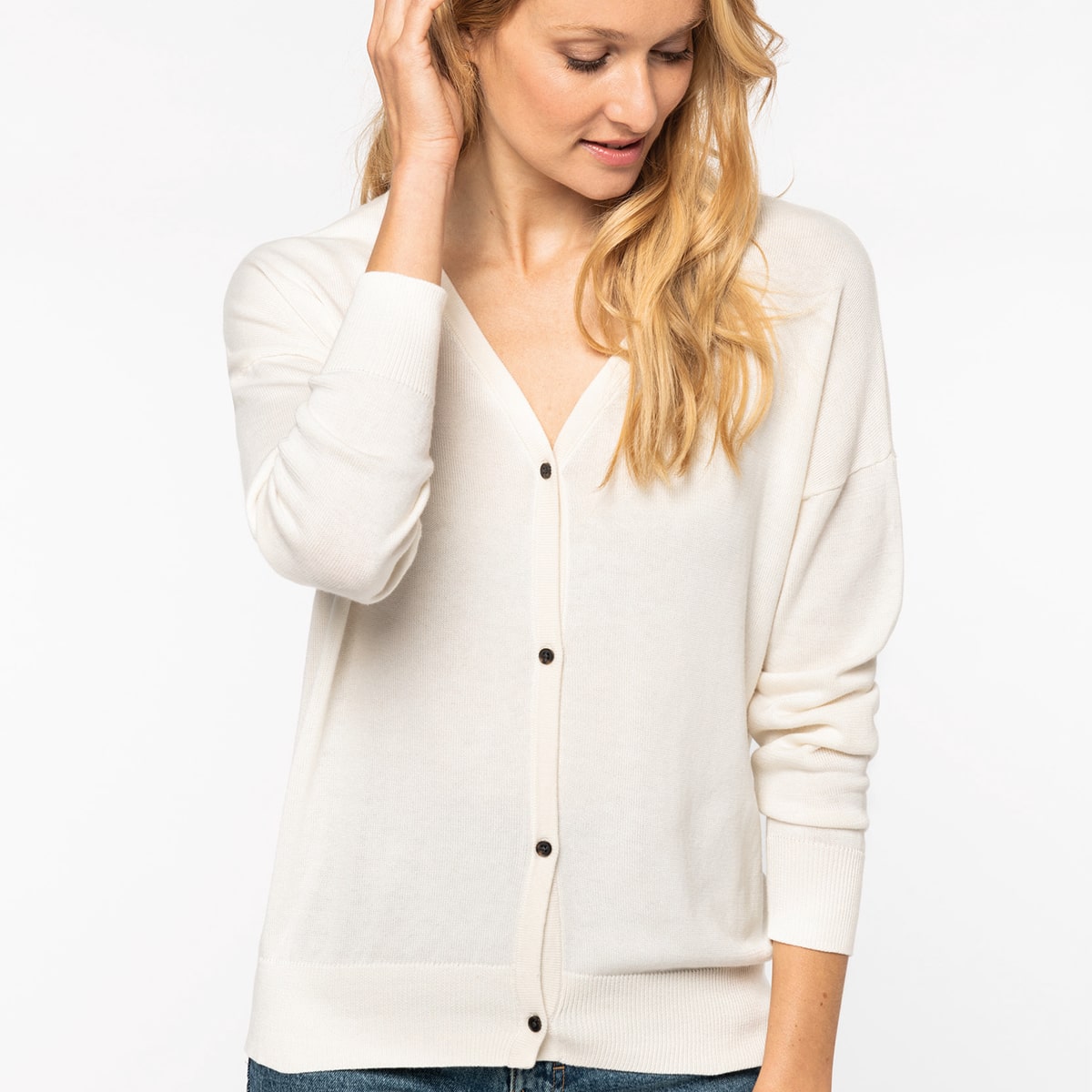 Bordi laterali a costine 1×1 doppi sul collo, patta anteriore piatta a fondo manica e fondo capo.