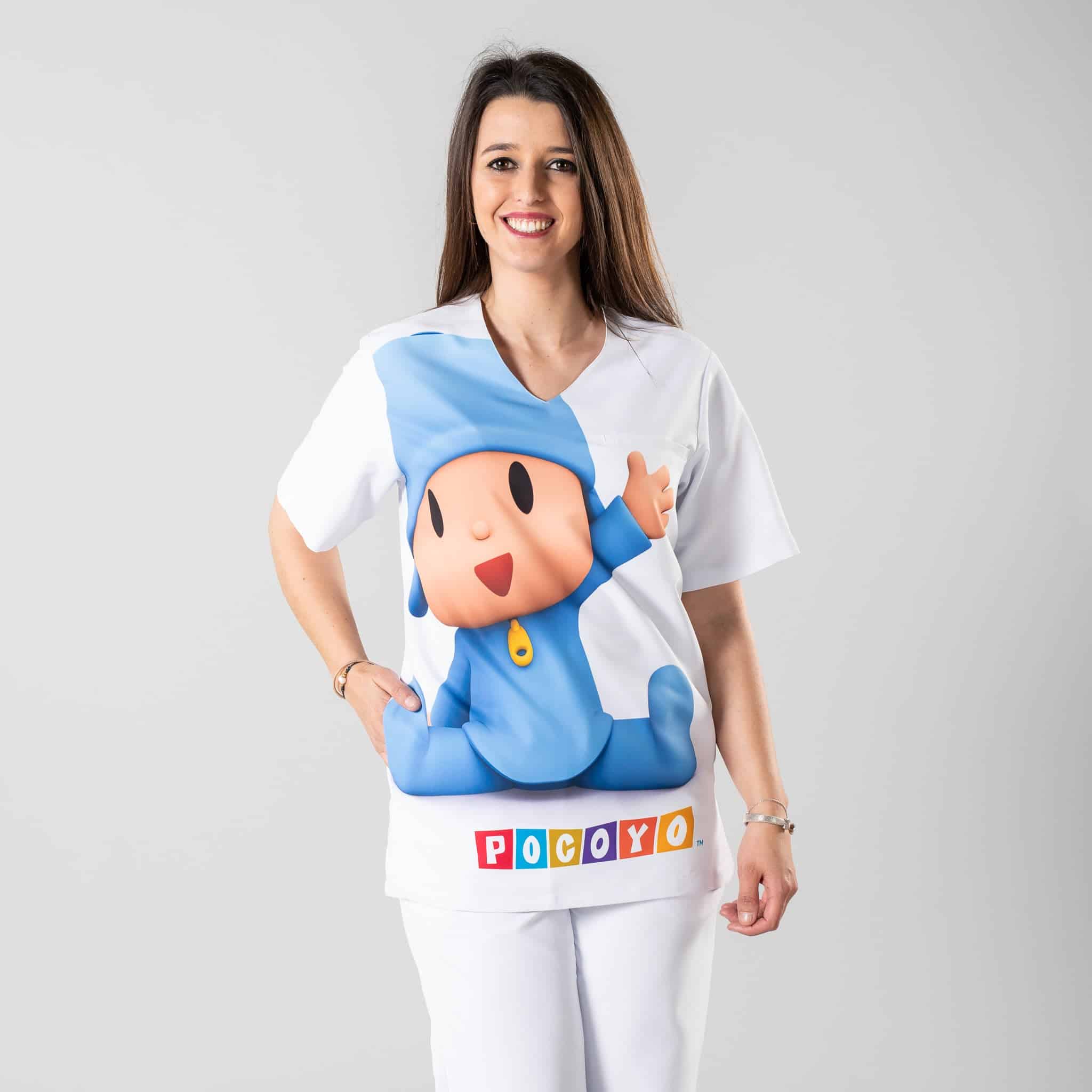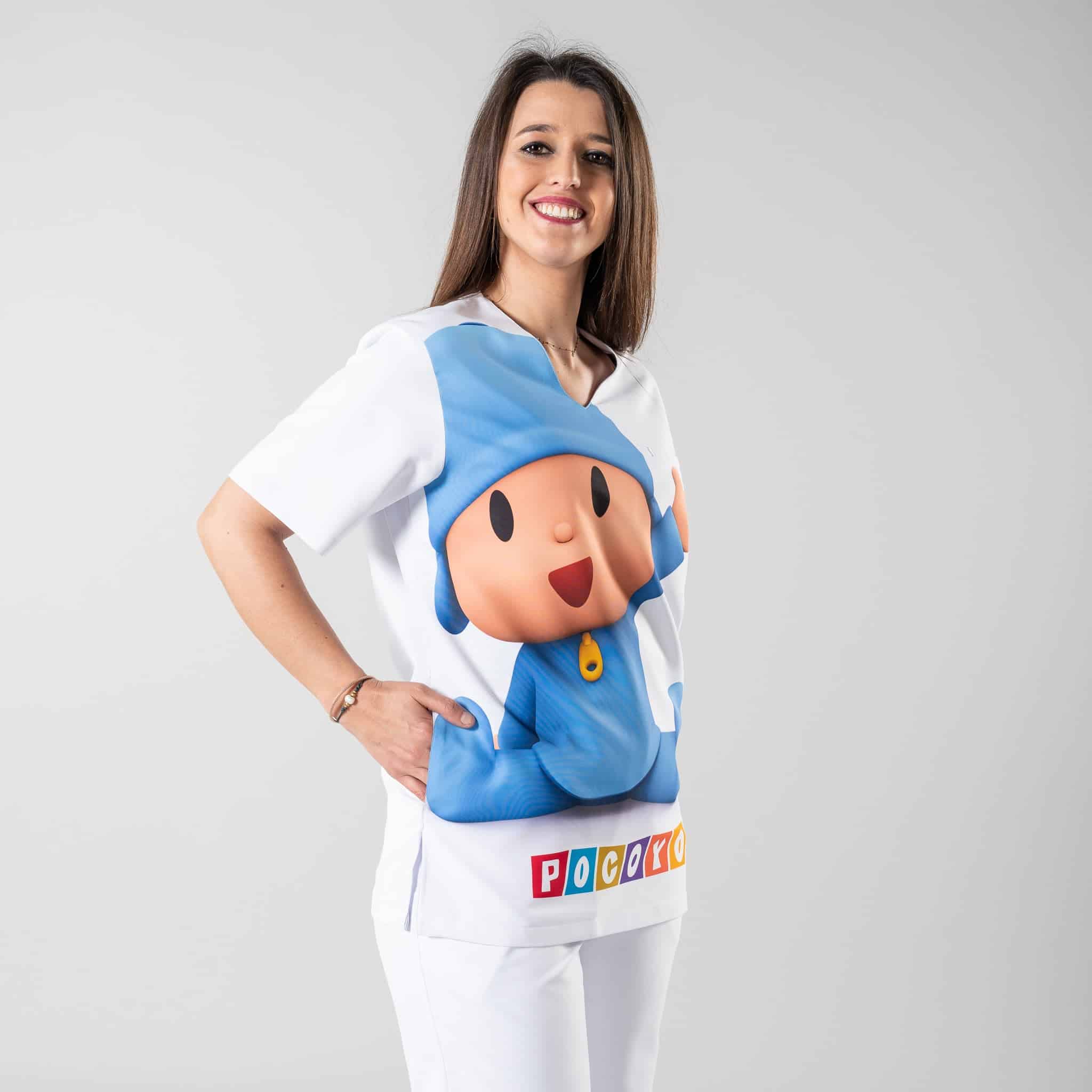 Casacca unisex in fantasia colorata e allegra ispirata al cartone animato Pocoyo. Ideale come divisa per reparti di pediatria e studi medici.