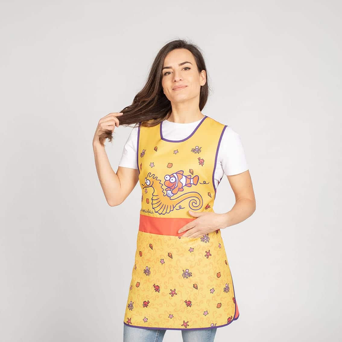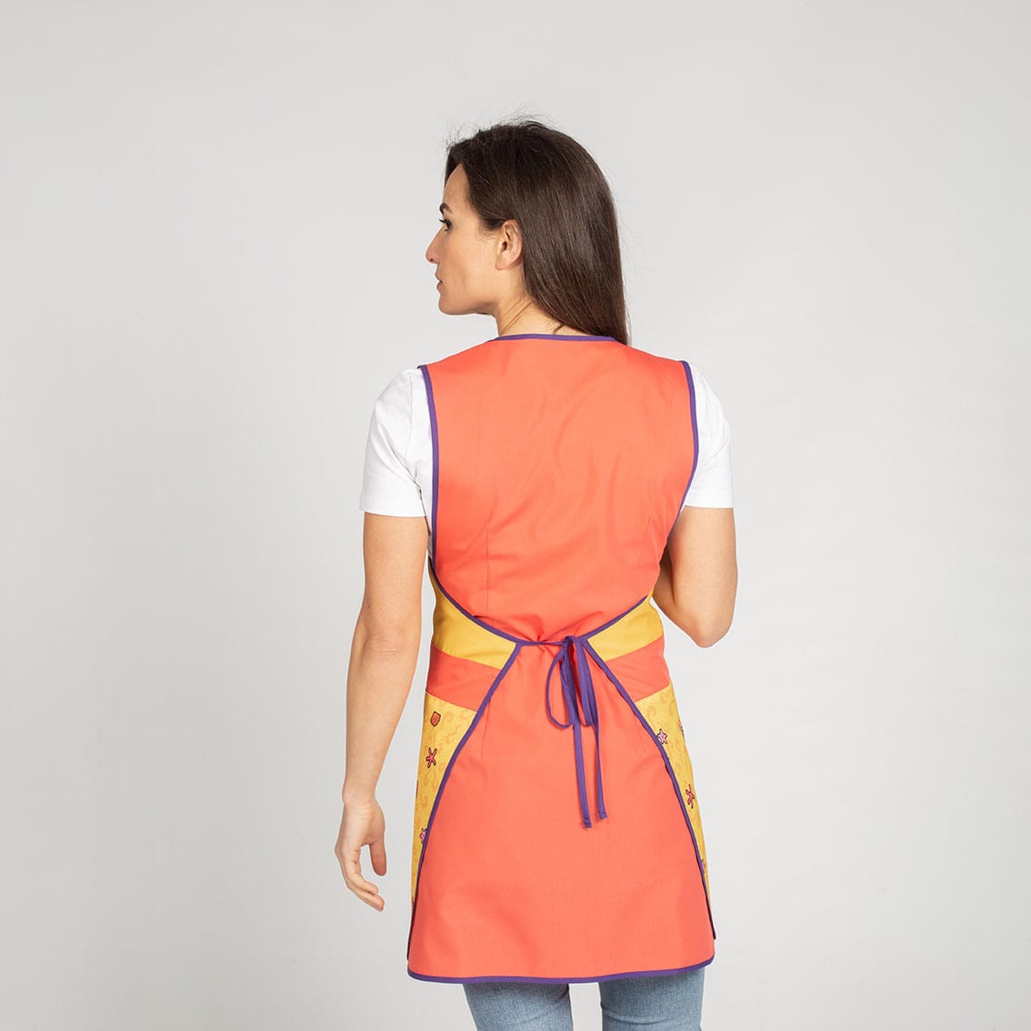 Pratico copriabito donna taglia unica colorato e allegro. Ideale come grembiule per maestre e collaboratrici scolastiche. Simpatica fantasia stampata. Chiusura con fettucce. Vestibilità Sagomata e regolabile a seconda della propria fisicità. Tessuto morbido Poliestere no stiro. Colori resistenti ai frequenti lavaggi.