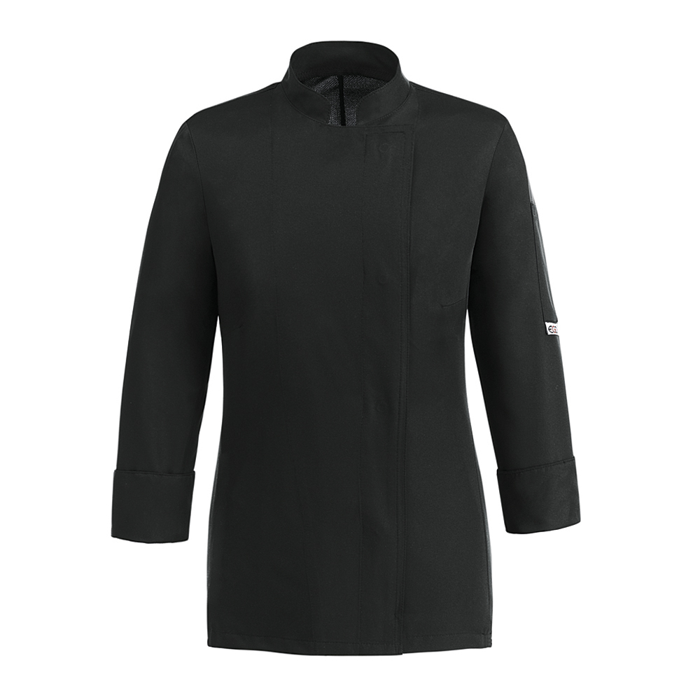 L’abbottonatura automatica nascosta, delinea la chiusura della casacca, rinforzata da un’impuntura.