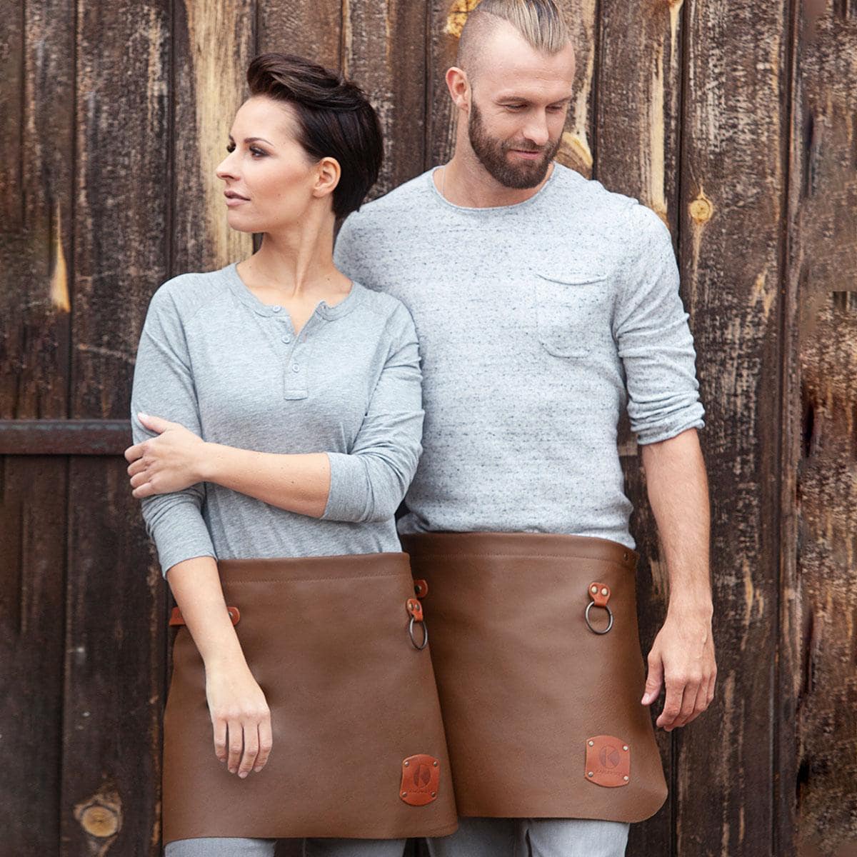 100% pelle bovina. Morbido grembiule con applicazioni in pelle colorata e borchie di metallo color bronzo, cinturino del grembiule regolabile con 10 fori, laccetto in pelle di colore cognac sul lato desto anteriore, pratico anello di metallo sul lato sinistro. Dimensioni: 59 x 40 cm.