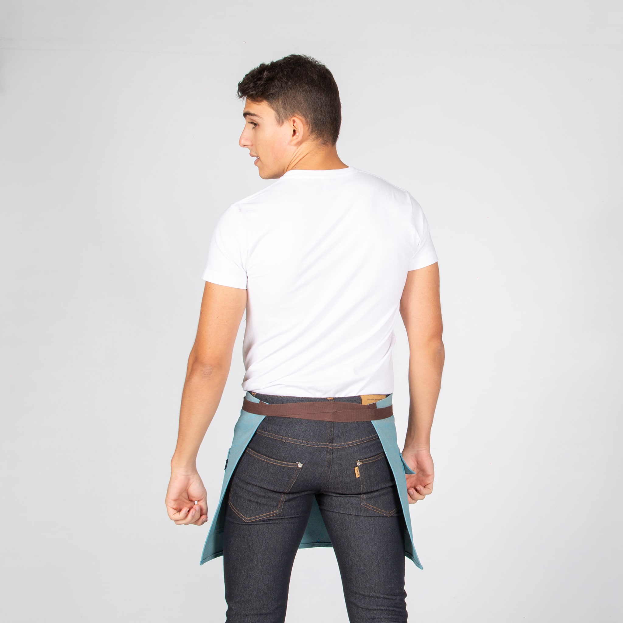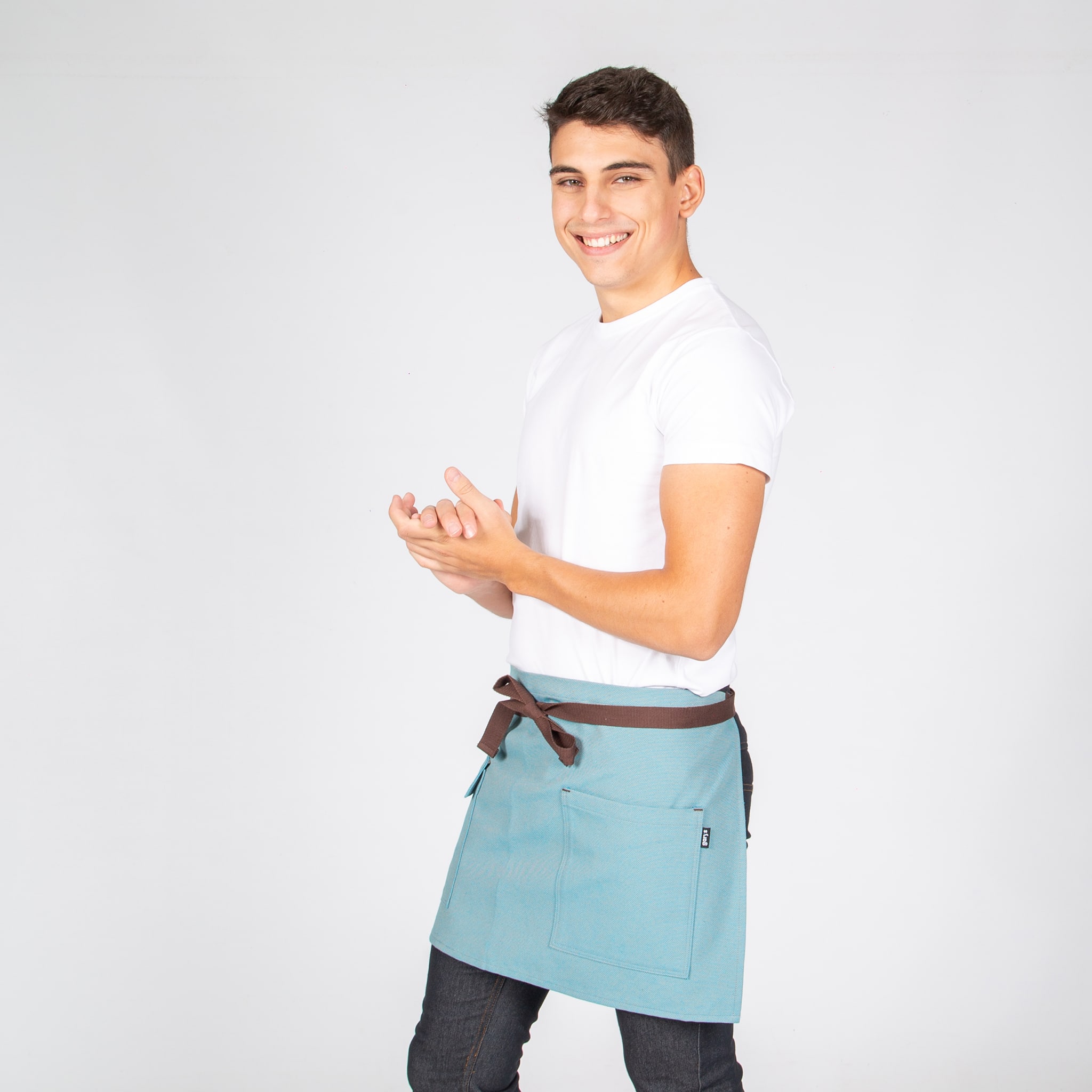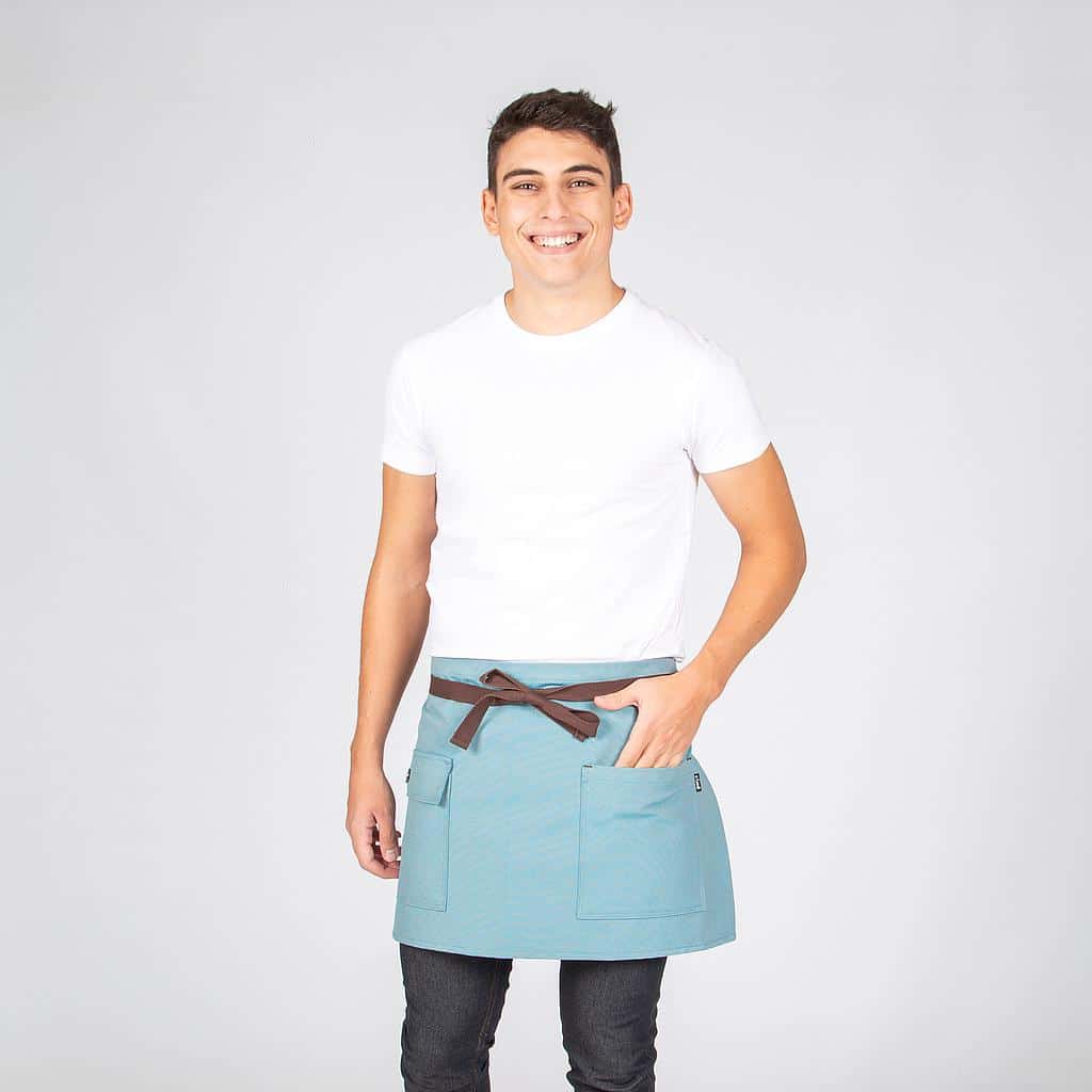 Grembiule corto con due tasche frontali. Ha cinghie laterali per annodare. Modello in nero, turchese, albero o verde cachi. Ideale per uniformi da bar, ristorante, caffetteria o negozio.