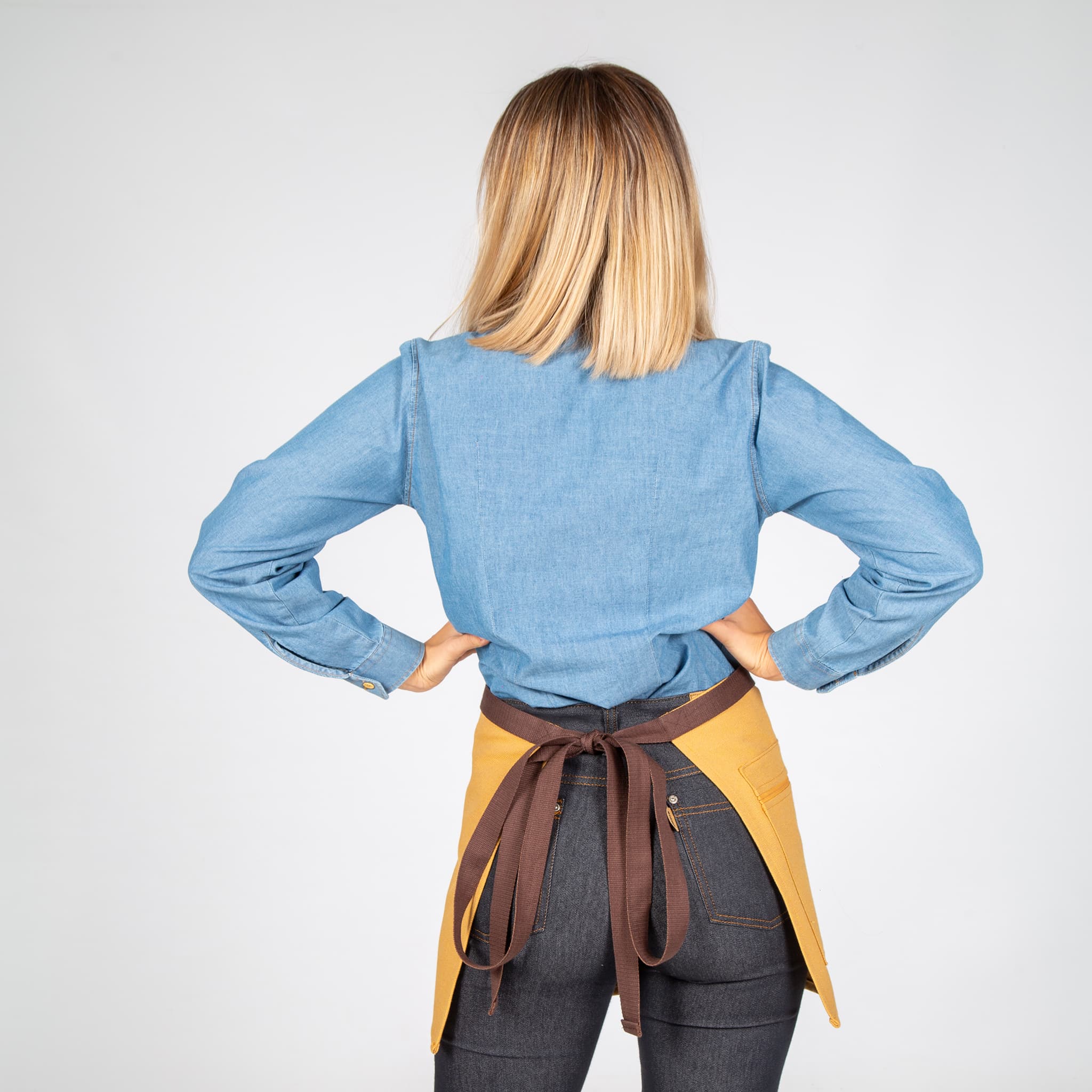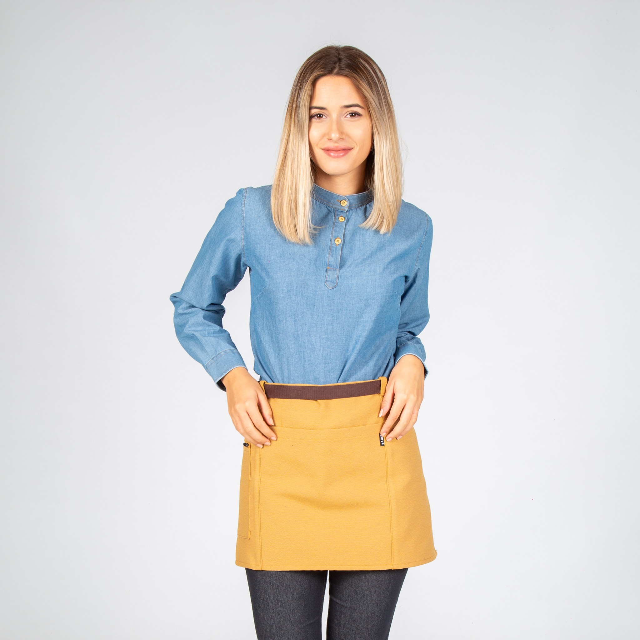 Grembiule corto con due tasche frontali. Ha cinghie laterali per annodare. Modello in albero, grigio, rosso, verde kaki o grigio antracite. Ideale per uniformi da bar, ristorante, caffetteria, chef o negozio.