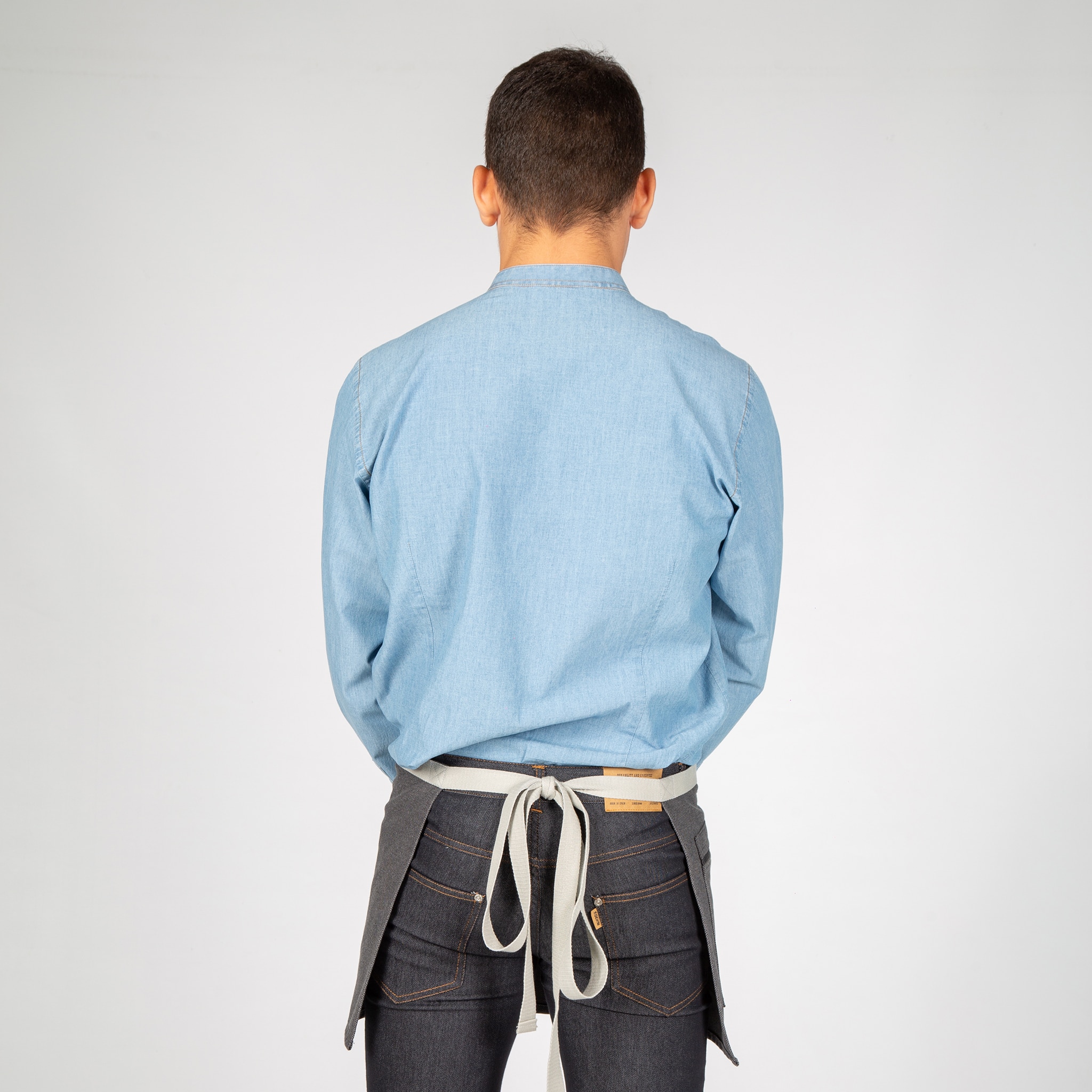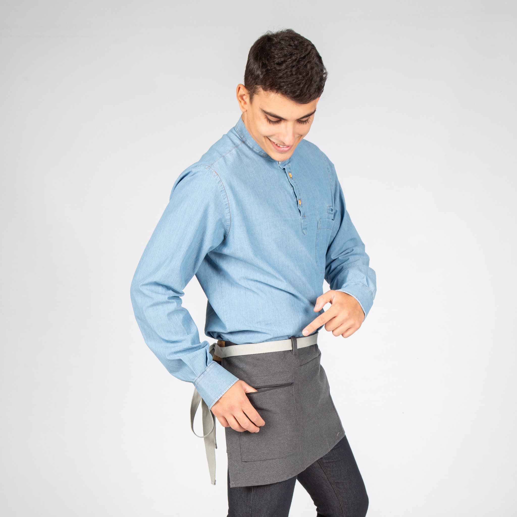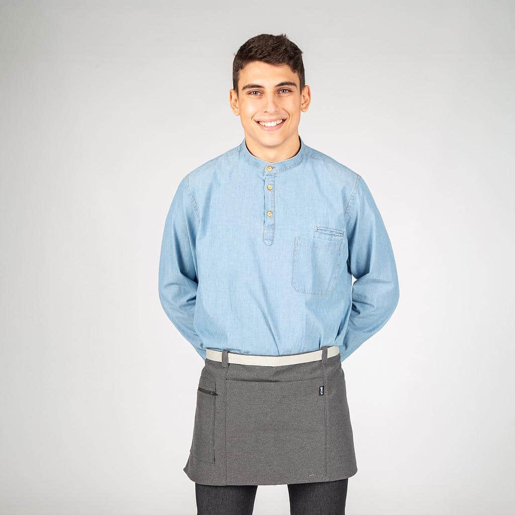 Grembiule corto con due tasche frontali. Ha cinghie laterali per annodare. Modello in albero, grigio, rosso, verde kaki o grigio antracite. Ideale per uniformi da bar, ristorante, caffetteria, chef o negozio.