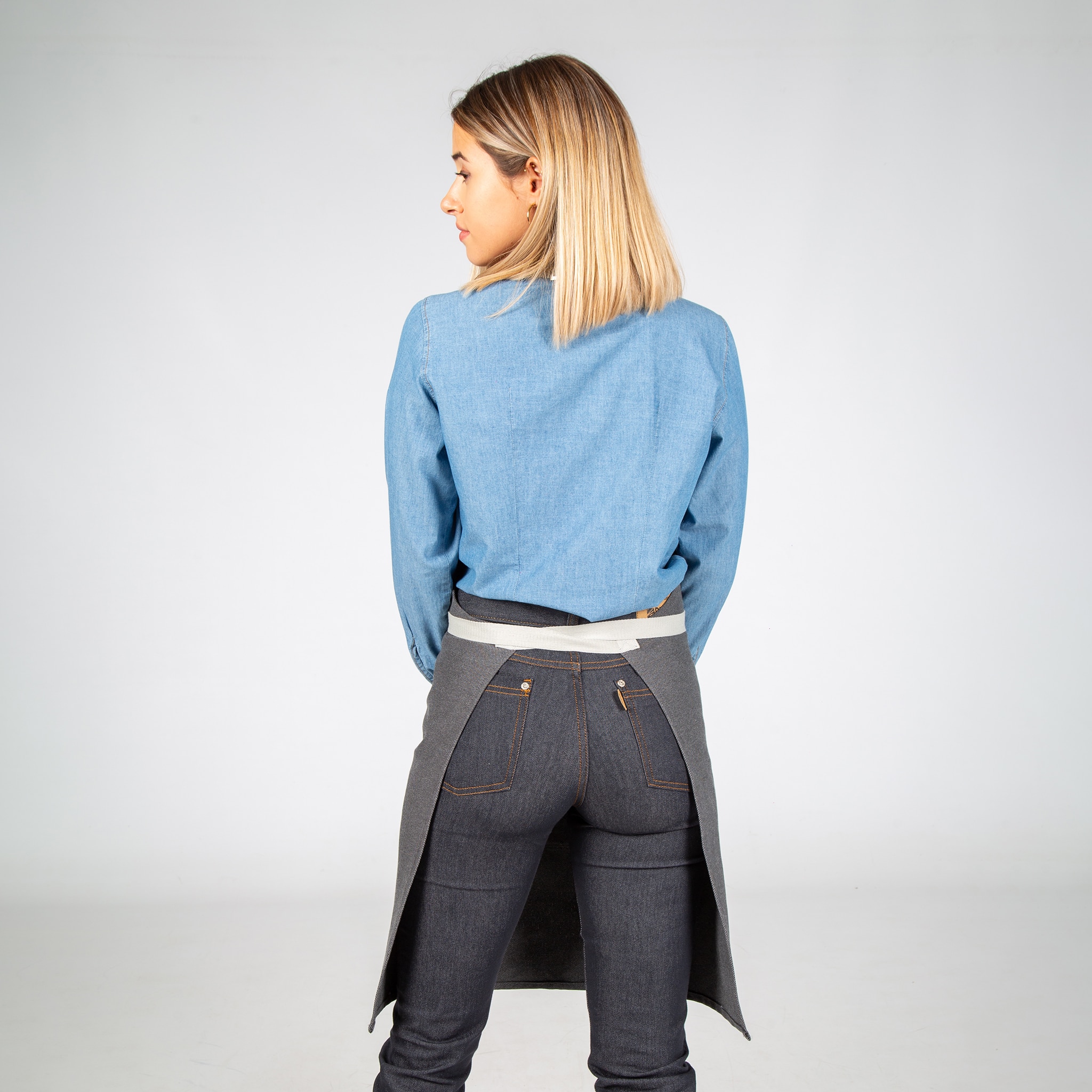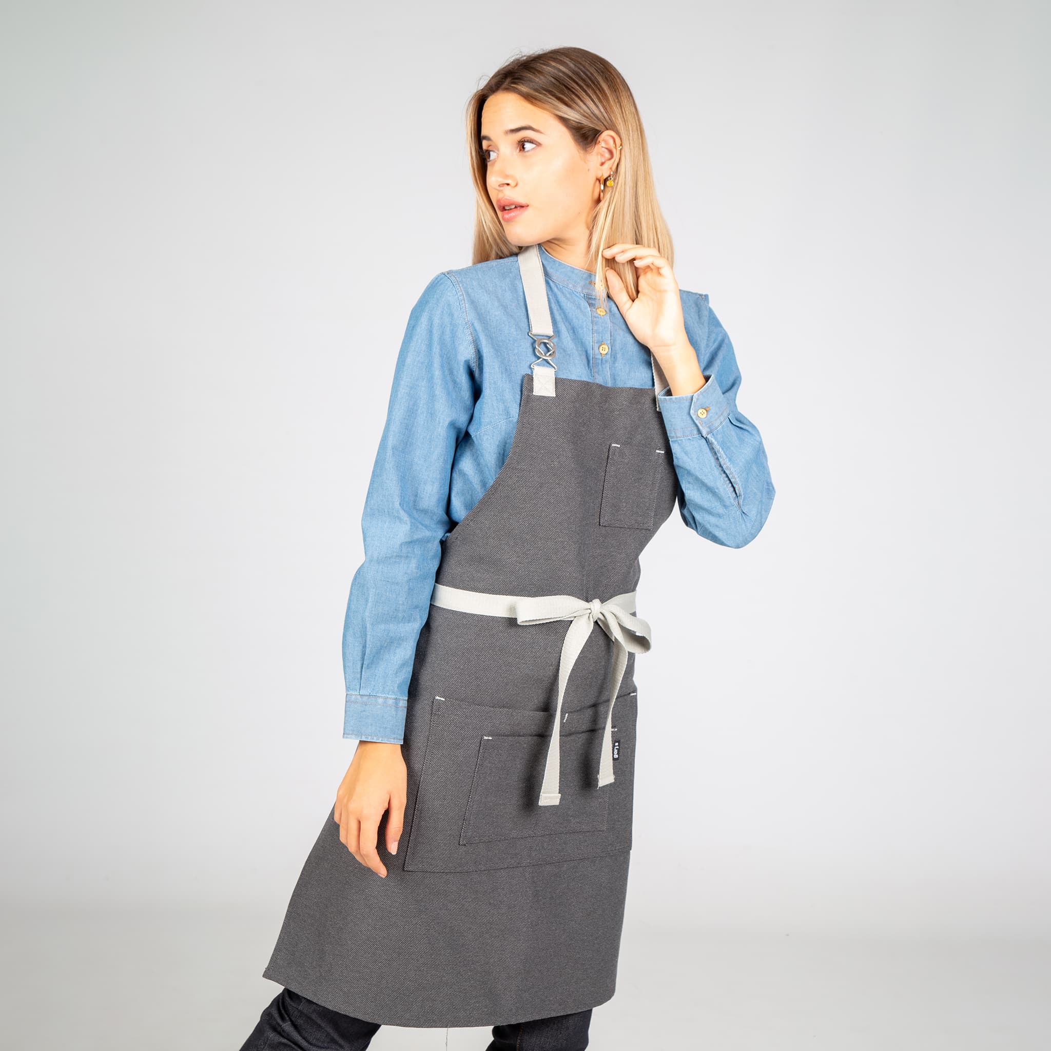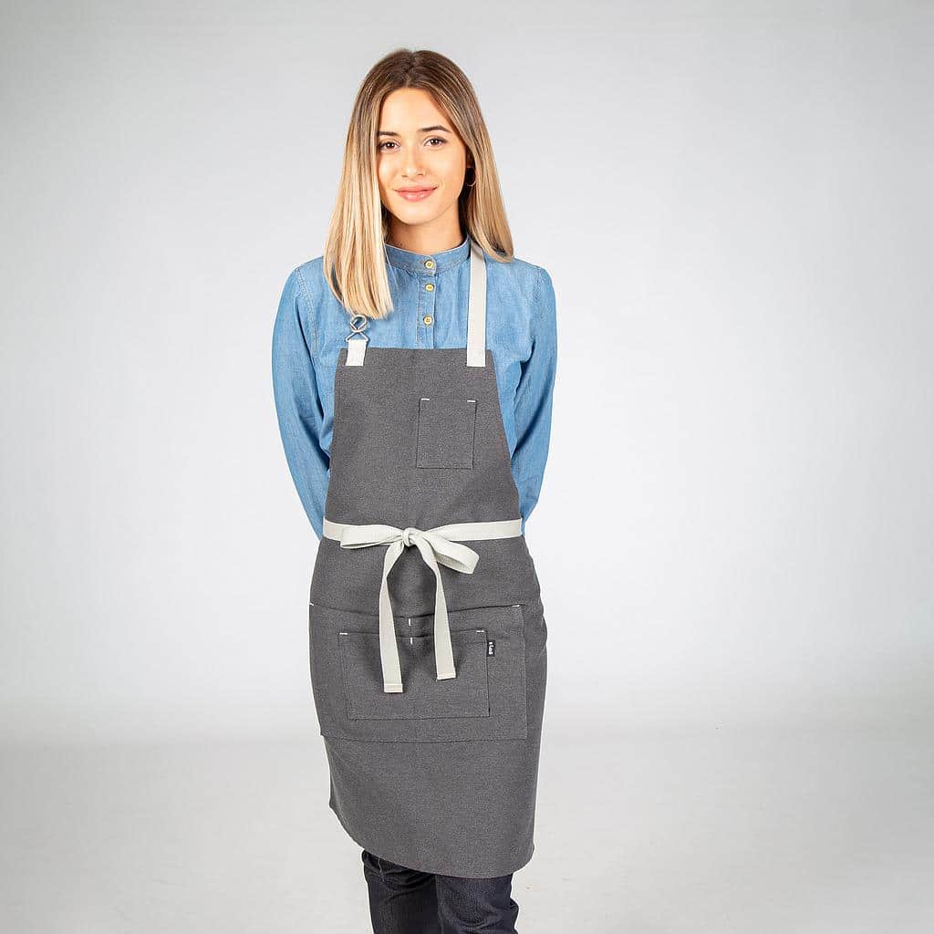 Grembiule con cinque tasche frontali. Ha un’originale chiusura con fibbia a incastro sul cinturino del collo e cinghie laterali per l’annodatura. Modello in albero, grigio, rosso, verde kaki o grigio antracite. Ideale per uniformi da bar, ristorante, caffetteria, chef o negozio.