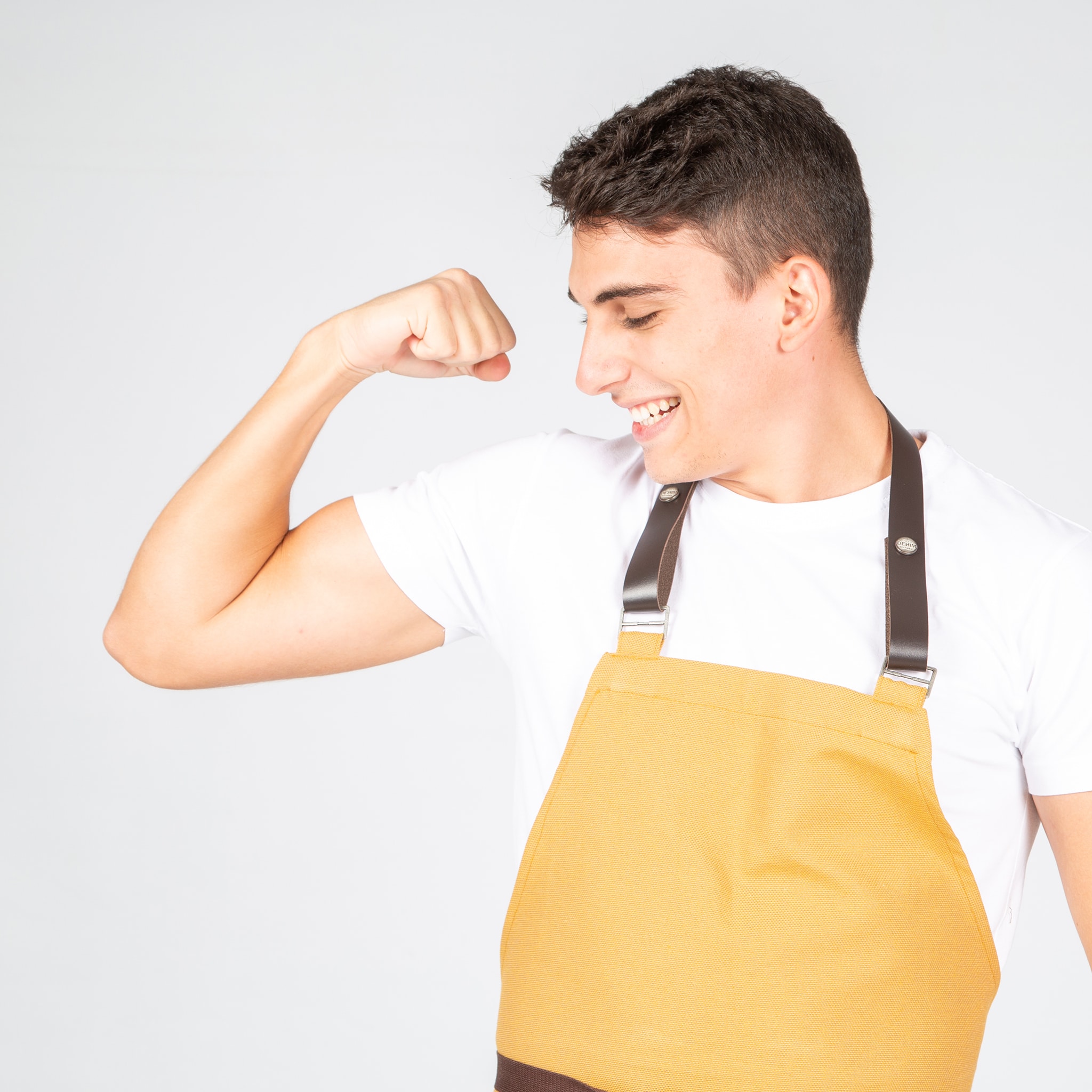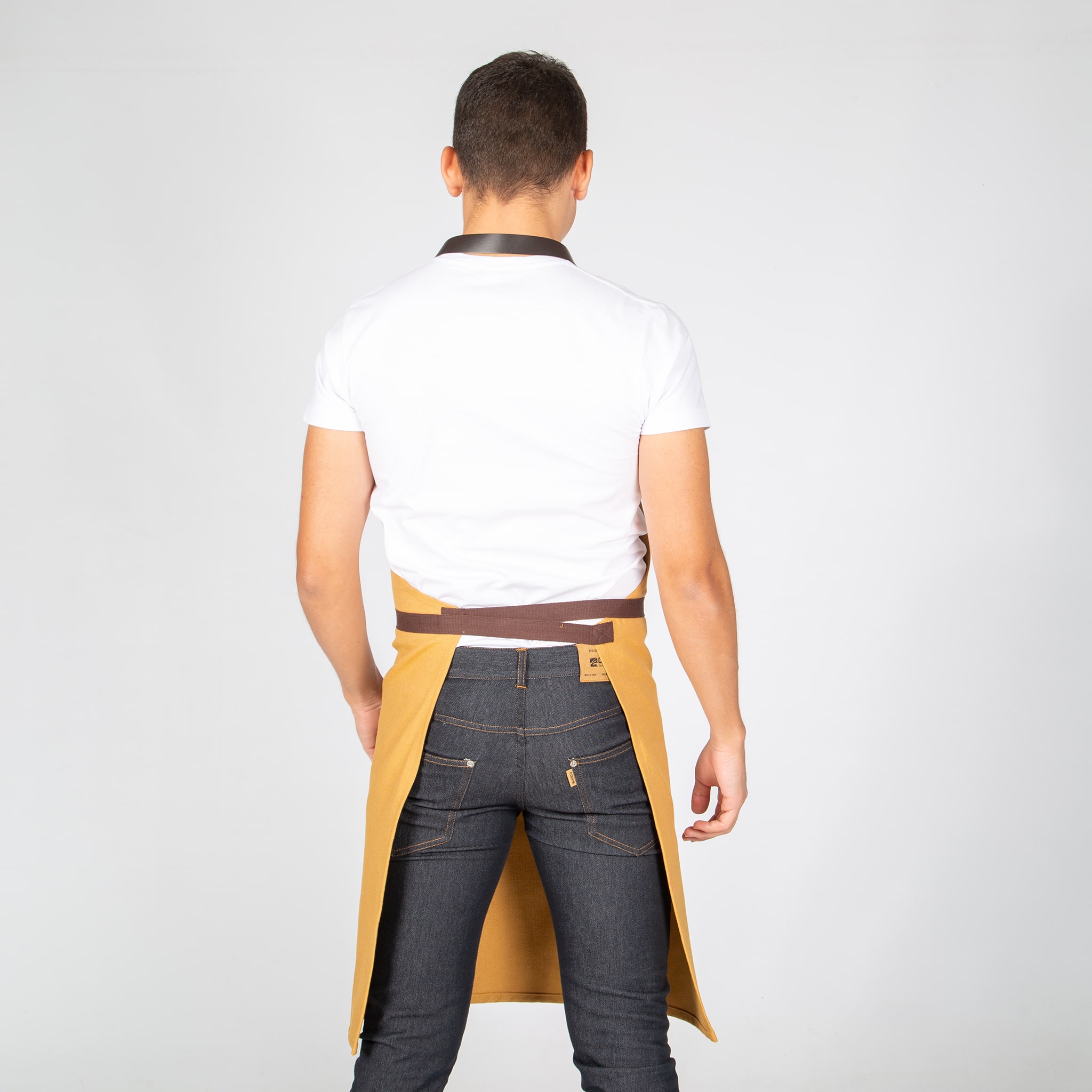 Grembiule con tre tasche frontali. Ha un cinturino del colletto in pelle fissato con bottoni a pressione e cinghie laterali per l’allaciatura. Ideale per divise da bar, ristorante, caffetteria, chef o negozi.