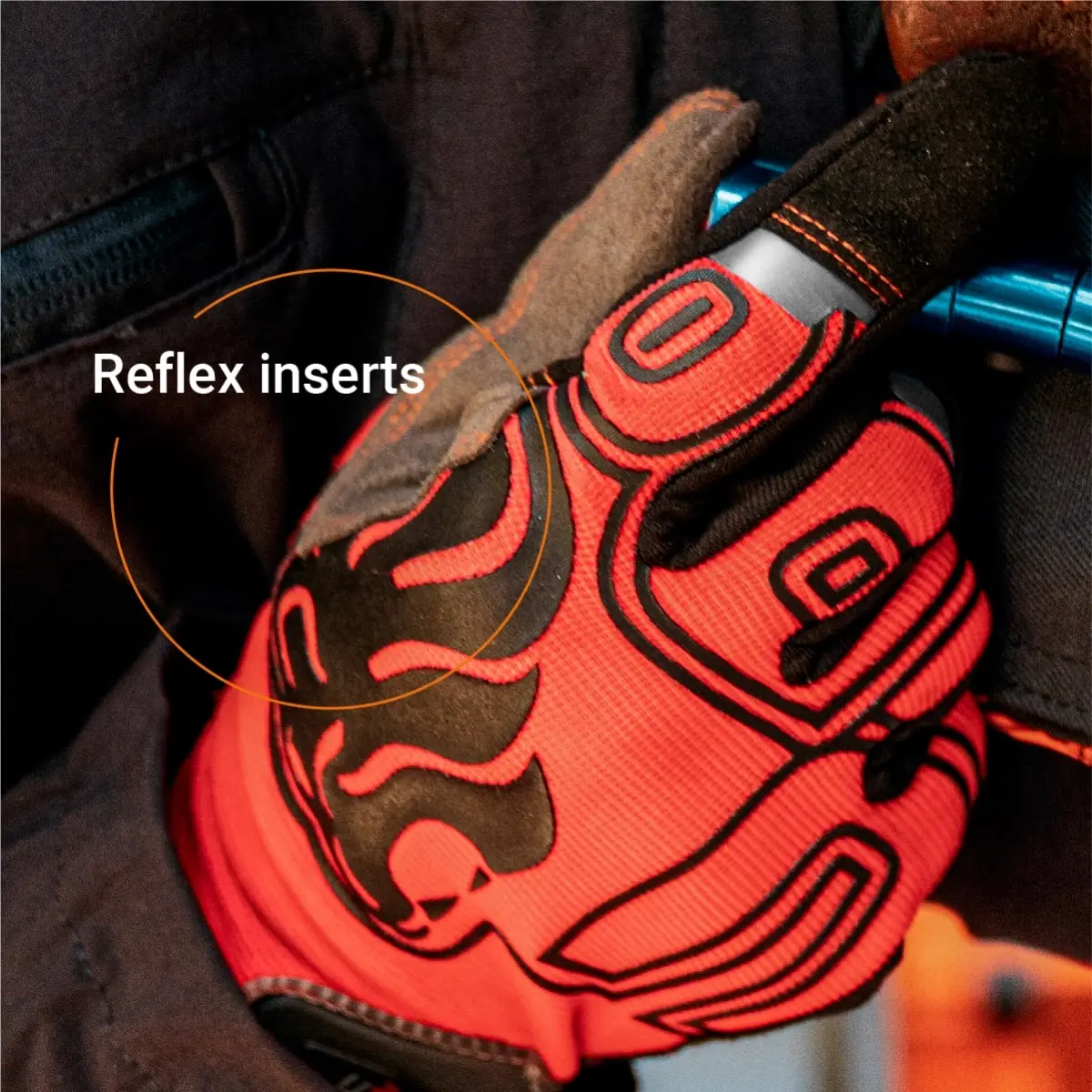 Guanto da lavoro con ottima vestibilità, destrezza e flessibilità. Dorso realizzato in materiale stretch, traspirante e di colore fluorescente con inserti reflex in corrispondenza delle dita per rendere i guanti più visibili in condizioni di scarsa illuminazione. Palmo in resistente pelle sintetica. Rinforzo tra indice e pollice. Chiusura polsino con velcro. Inserti in tessuto elasticizzato tra le dita e finitura in silicone sulle dita per aumentare il grip della presa. Questo guanto è inoltre touchscreen compatibile per l’utilizzo di smartphone e tablet che permette di rimanere sempre connessi sul lavoro.