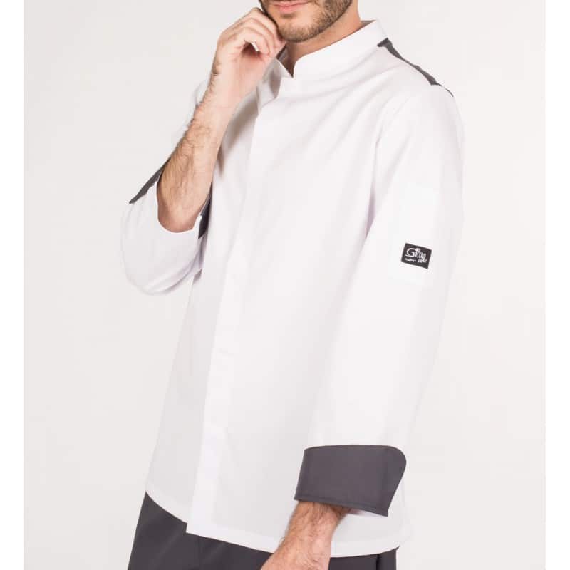 Giacca GASTROCHEF da uomo, a maniche lunghe, con polsini arrotolati, chiusura centrale con automatici nascosti e una tasca sulla manica sinistra. Modello semiaderente, con cuciture sul retro. Disponibile in bianco o nero, con COOLMAX sui lati e spalle e polsini abbinati. Ideale per camerieri, cuochi e chef di hotel, ristoranti e cucine in genere.