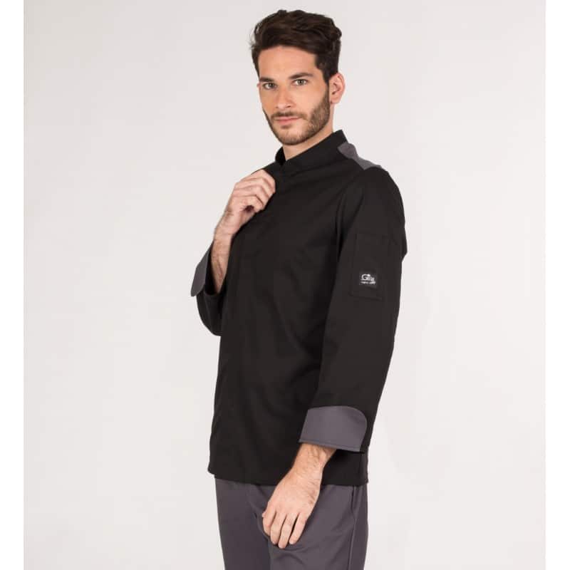 Giacca GASTROCHEF da uomo, a maniche lunghe, con polsini arrotolati, chiusura centrale con automatici nascosti e una tasca sulla manica sinistra. Modello semiaderente, con cuciture sul retro. Disponibile in bianco o nero, con COOLMAX sui lati e spalle e polsini abbinati. Ideale per camerieri, cuochi e chef di hotel, ristoranti e cucine in genere.