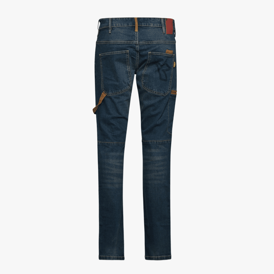 Denim workwear stone washed, elasticizzato. Trattamenti e cura dei dettagli tipici della tradizione della jeanseria italiana. Ginocchiere e tagli ergonomici, portametro e portamartello, dettagli a contrasto in canvas.