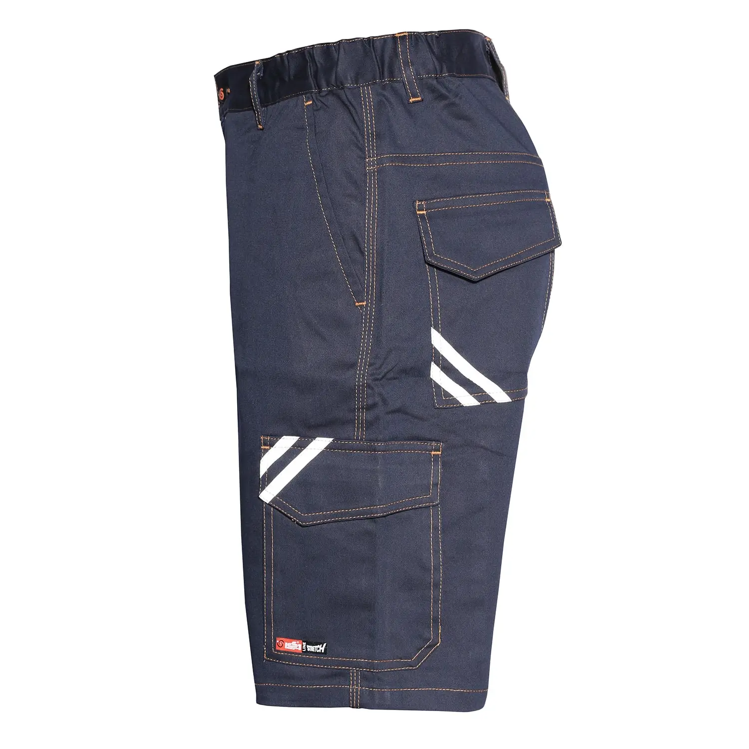 Bermuda stretch con inserti retroriflettenti, dotato di due tasche frontali, due posteriori coperte da pattina, una tascone laterale con soffietti ed una tasca porta metro.