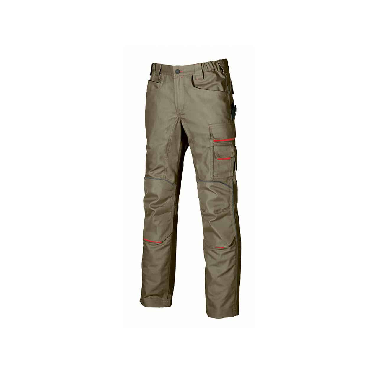 Pantaloni da lavoro U-Power Free sabbia dotato di 2 ampie tasche anteriori, tasca laterale portautensili, tasca laterale multifunzionale con portacellulare, portabadge, 2 tasche posteriori con chiusura di sicurezza a velcro, 2 tasche porta ginocchiera con interno elasticizzato; porta martello regolabile; regolazione in vita con elastico per massimo comfort.
