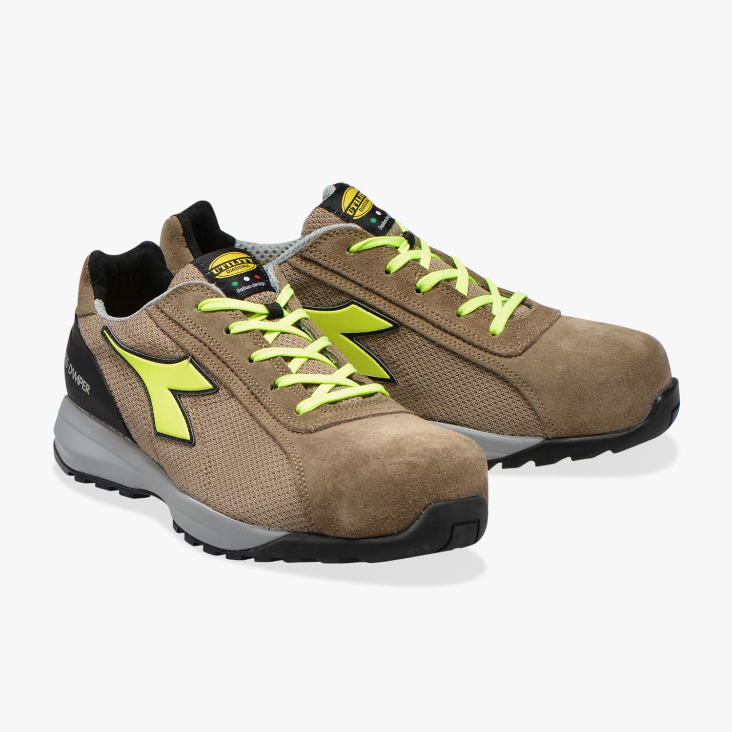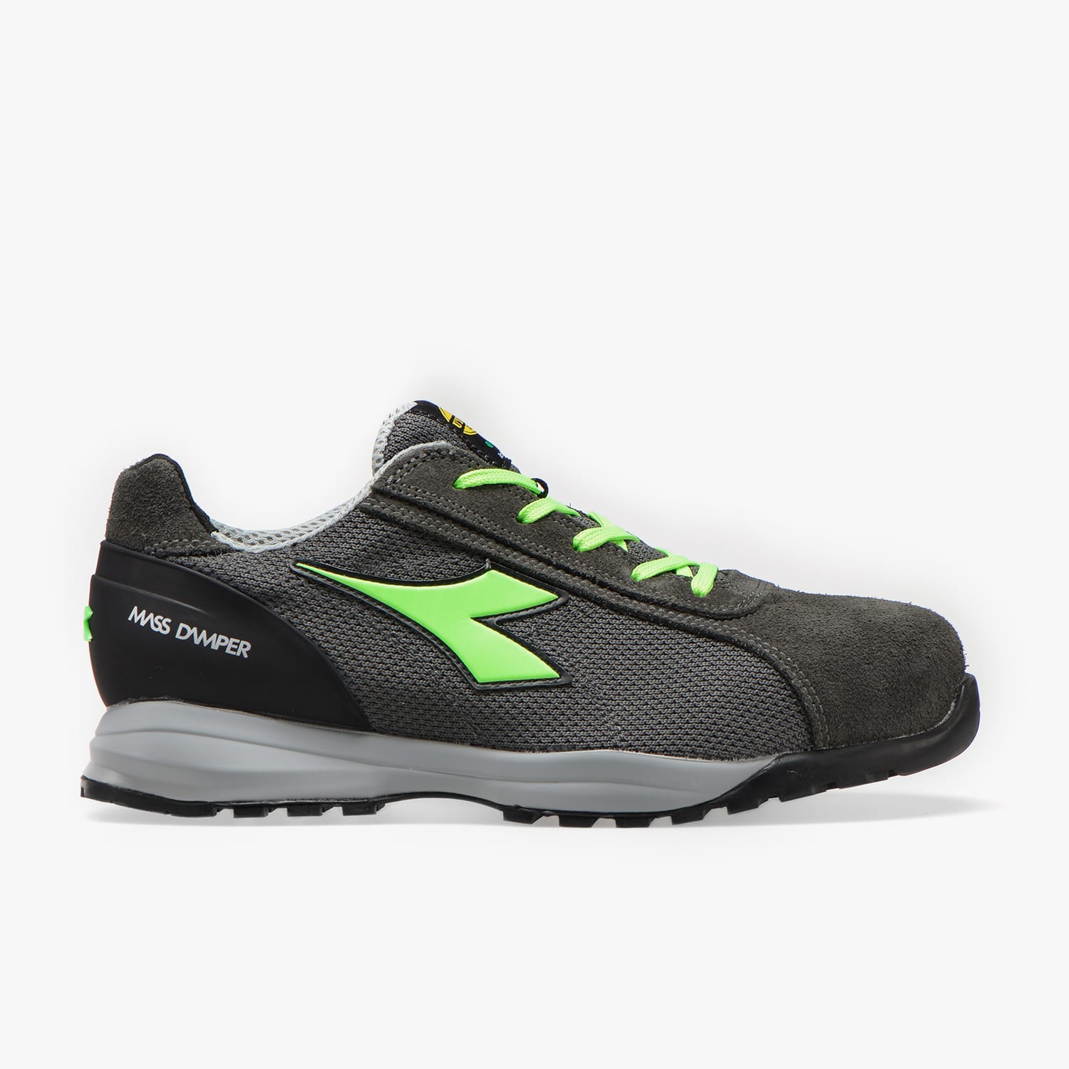 Calzatura di sicurezza bassa S1P vitello scamosciato e mesh. Mass Damper Technology, puntale in alluminio 200J. Calzata 11. Fodera Air Mesh, K SOLE, film in TPU. Plantare anatomico estraibile in PU foam e carboni attivi. Protezione del tallone in TPU.